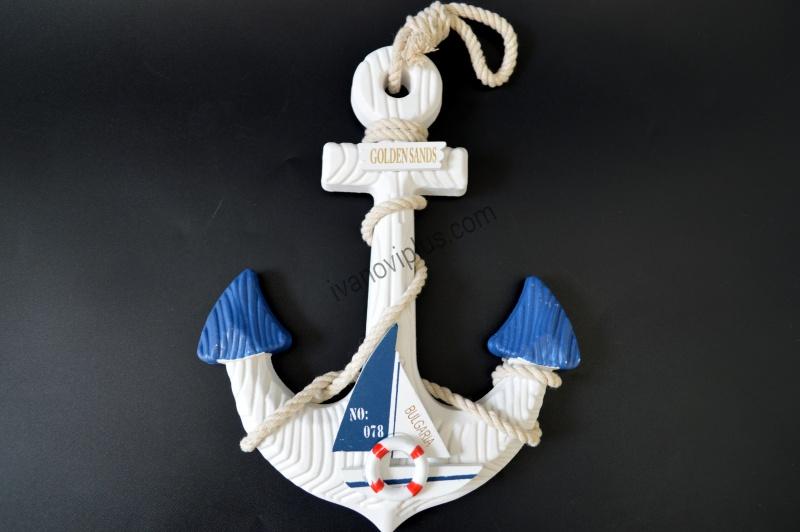 дървен сувенир, котва 17х22 см. с корабче с надпис на платното Bulgaria оплетено въже и табелка Golden Sands (6 бр. в кутия)(48 бр. в кашон)